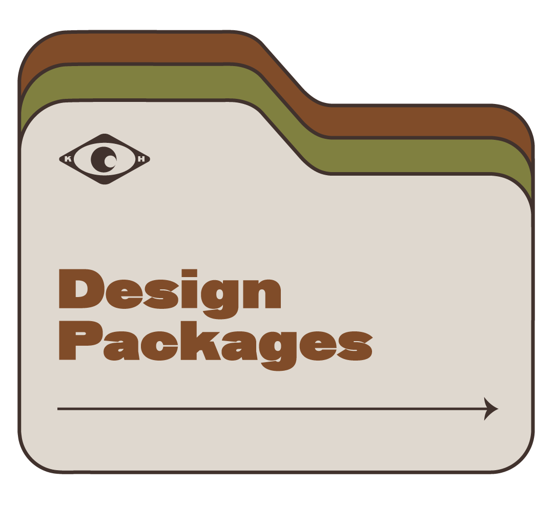 • Retro-style graphic design package cover with layered rectangular shapes, an eye illustration in the top left corner, and the text 'Design Packages' in bold brown font, with a small arrow at the bottom right.
