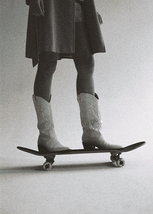 Person wearing cowboy boots and black tights standing on a skateboard.