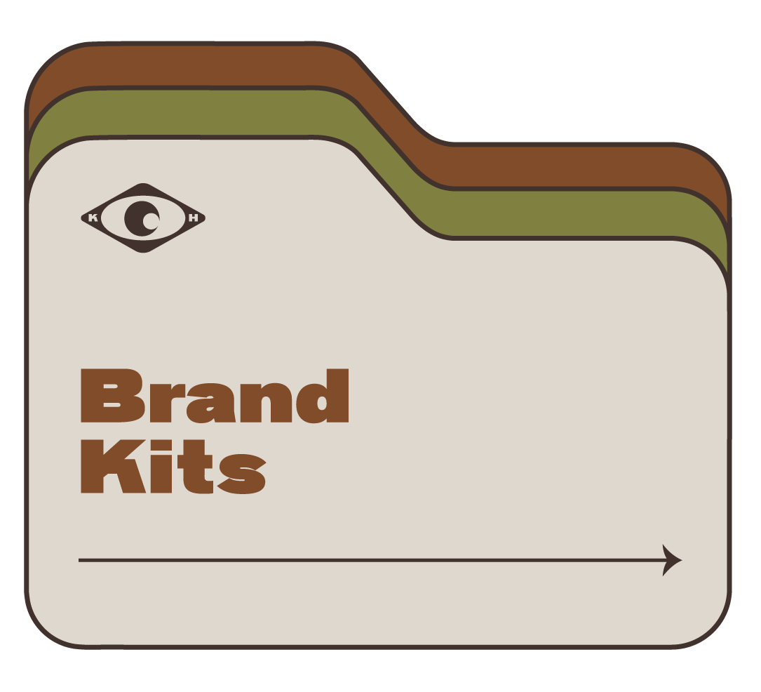 • Stylized graphic design with layered shapes in brown, green, and beige, featuring a black and white eye symbol with the letters 'K' and 'H' inside, and the text 'Brand Kits' written in bold brown font.