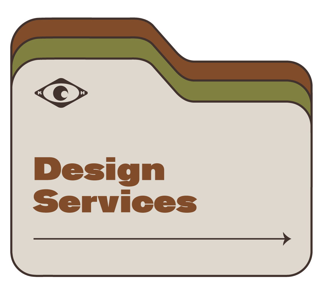 • Retro-inspired graphic design with layered shapes, eye symbol, and the text 'Design Services' in bold brown font.